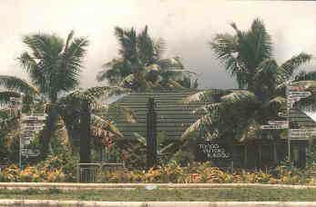 Das erste Visitor Büro wurde 1971 am alten Oil Depot in der Nähe des Hafens gebaut. Am frühen Morgen des 23. Juni 1977 wurde Tongatapu von einem starken Erdbeben mit der Stärke 7,2 auf der Richterskala heimgesucht. Das erste Visitor Büro wurde so stark beschädigt, das es ausgelagert werden mußte und privat in der Nähe des Palastes untergebracht wurde. Des Königs Parlament beschloß den Bau eines neuen Büros an der Vuna Road (ugs. Seestraße, Wasserfront) Australien gab speziell für den Neubau A$ 45.000.- als Geschenk. Der Hon. Baron Vaea, damaliger Minister für Arbeit, Handel und Industrie und damaliger Premier Minister hieß zur Eröffnung den König und offizielle Gäste sowie Repräsentanten aus Australien, New Zealand und Mitglieder des diplomatischen Corps bei traditionellem Tongan Kava ( leicht narkotisierendes Rauschmittel, macht sehr früh graue Haare, wird in Deutschland zu Schlafmittel verarbeitet) und Tongantanz herzlich willkommen. Das neue Tongan Visitor Büro ist ein im Original Tongan Baustil und Material entstandene Gebäude und ist für Studien der Bautechnik hervorragend geeignet, außerdem stehen nette Damen mit Informationsmaterial und für Ihre Fragen bereit. Die beiden 4,60 m hohen geschnitzten Säulen sind ein Geschenk von New Zealand und stellen eine männliche und eine weibliche Figur dar. Das Genital der männlichen Figur ist nicht dargestellt, da es in Tonga verboten ist, in New Zealand ist es erlaubt. In den einzelnen Bändern findet man Abbildungen von Handlungen und Tieren. Drei Tonganer haben 1976 das traditionelle Holzschnitzen in einer Schule in New Zealand erlernt und geben ihr Wissen an andere weiter. Die Hinweisschilder einiger internationaler Großstädte sind Mitte 1990 mit Richtungs- und Entfernungsangabe hinzugekommen. FRANKFURT 19.150 km, TOKIO 12.180 km, AUKLAND 2.005 km. |